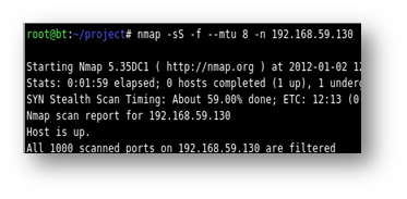 This time nmap’s fragmentation option with a setting of 8 byte was executed with fragroute fragmenting this scan further according to the default settings.