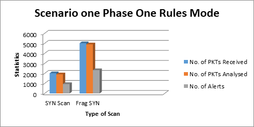 Phase one – here the IDS relies only on the rules (signatures) that it contains to detect attacks because an important component (pre-processor) was disabled. Thus this mode was called rules only mode. As seen in chapter 6.1 all attacks were successfully detected even when nmap’s fragmentation was used, which demonstrates that the IDS successfully detected the attacks by just using the rules only.