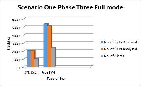 Phase three – this final phase of this scenario the IDS was operated in full mode, meaning the pre-processors as well as the rules were activated. Again here it can be established that all of the attacks were detected and the system and its components are fully operational.