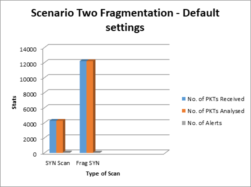 As this was the main scenario of the study, two of the evasion techniques discussed in chapter two was chosen for the experiments of this study. Here the experiments were divided into three parts and the IDS was operated in full mode, the first part tested fragmentation techniques using three different configurations to test the same two reconnaissance attacks used in scenario one (SYN and nmap Fragmented SYN scans). The second part investigated the evasion techniques provided by metasploit as well as when these methods are combined with fragroute, while the third and final part used encrypted tunnel to evade detection.
